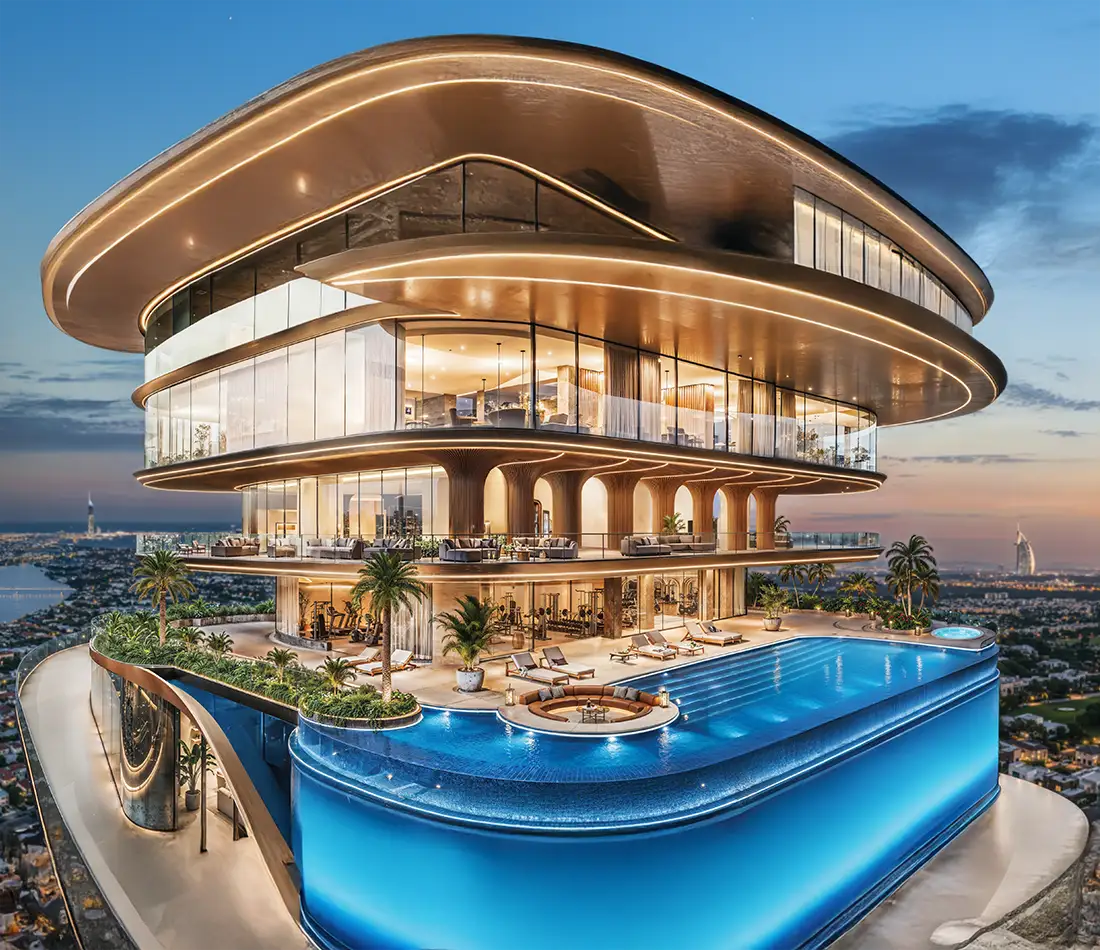 Shahrukhz Danube is a premium 55-storey tower offering a stylish lifestyle with over 35 modern amenities. The ground floor includes an SRK selfie spot, valet parking, drone dock, and EV charging points. Level 9 has fun and relaxing spaces like a cricket pitch, padel court, networking zone, and zen garden. Levels 33 to 35 offer a sky pool, gym, clubhouse, meeting rooms and Lounge 33. The tower also features a rooftop helipad, making it a unique and iconic place to live or invest.